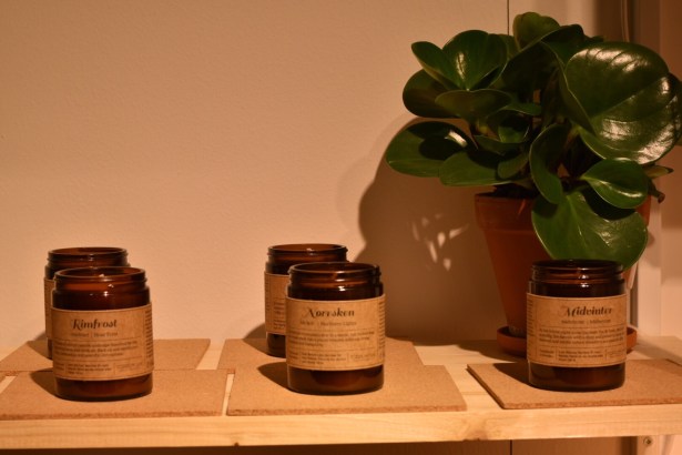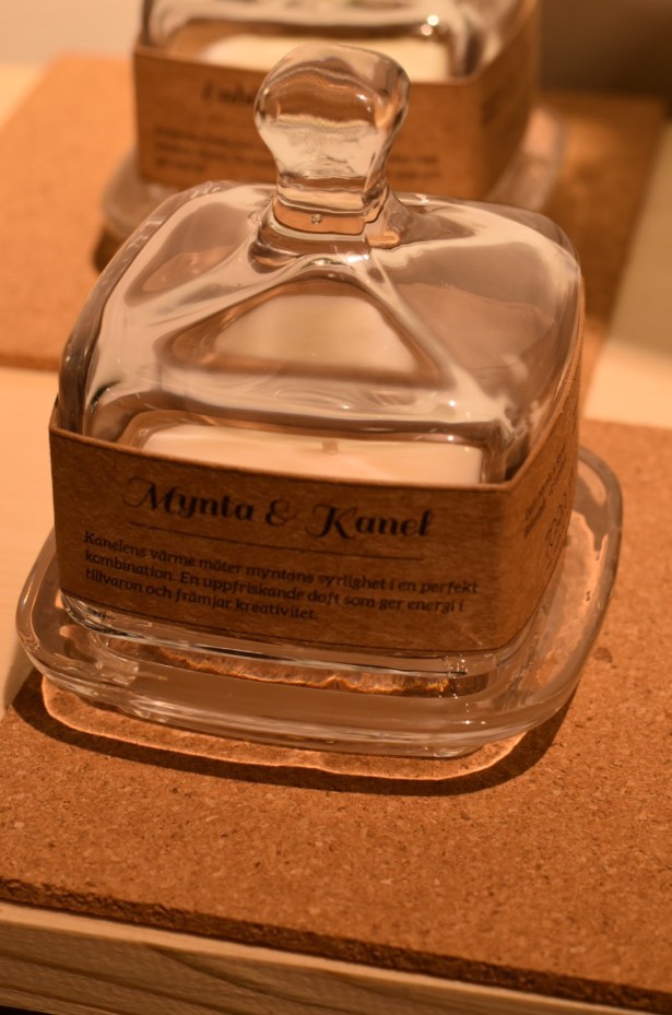 Efter ha pratat en stund och fotat alla snygga förpackningar kommer en av ägarna dit och då visar det sig vara Hannes som gått ett år över mig genom hela grundskolan! Företaget är nu Stockholmsbaserat och jag älskar deras miljötänk med återvunnet glas som ska kunna ha en funktion efter utbrunnet ljus. Som deras små ”smörbyttor” som blir bra flingsaltsaskar efteråt!