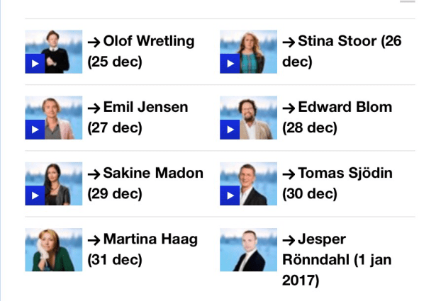 Jippie Tomas Sjödin igen! Den 30 de sitter jag bänkad! Andra som kan va kul är Martina Haag och Olof Wretling som är den som startar alltihop på juldagen!